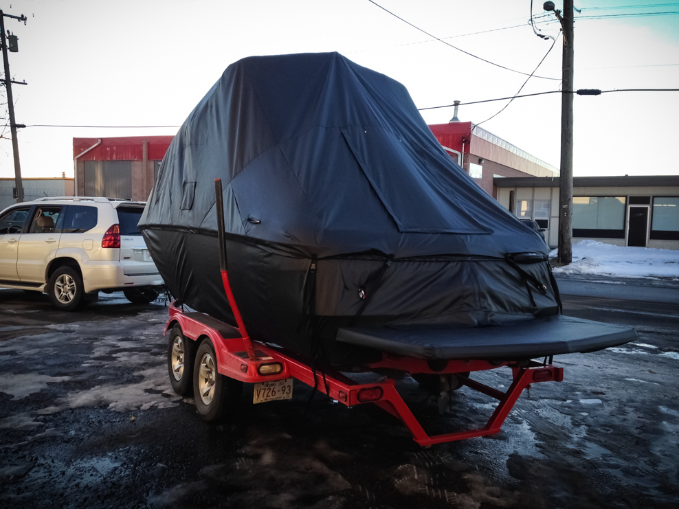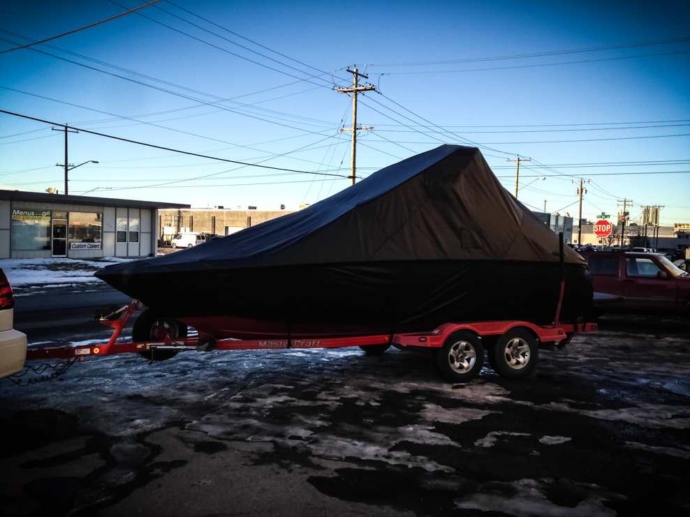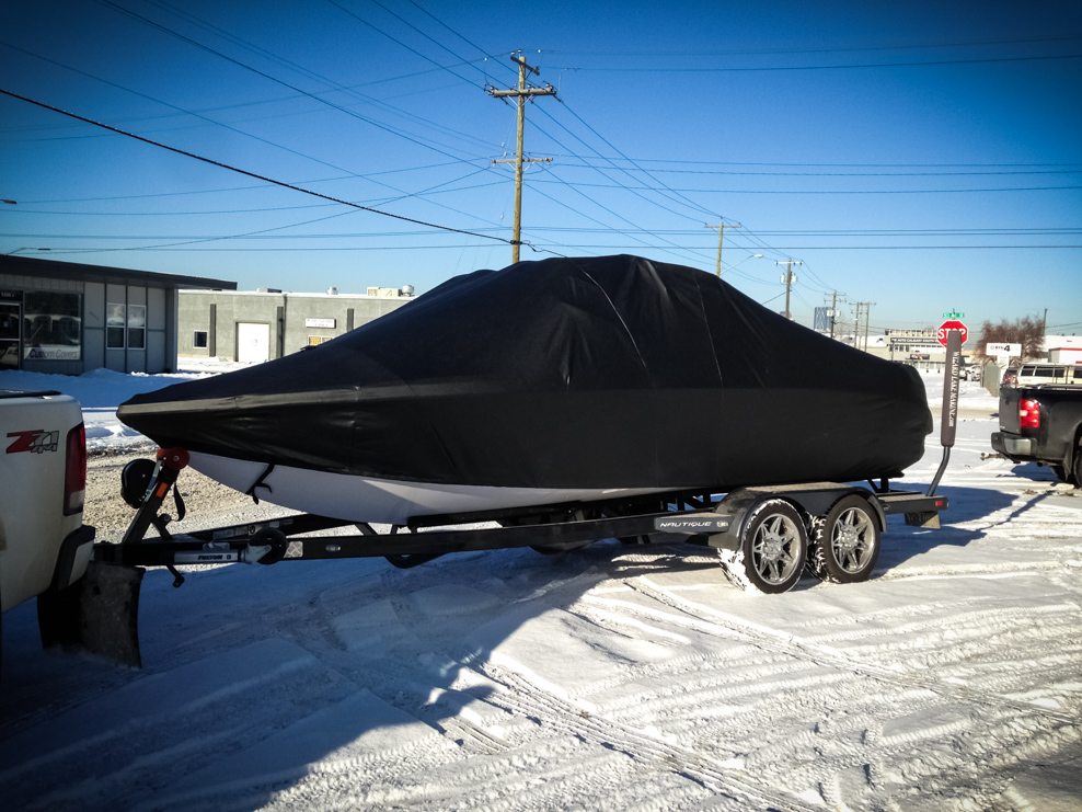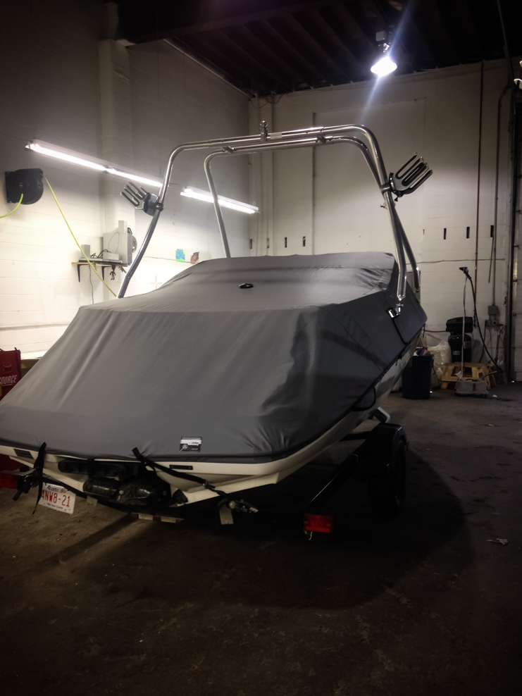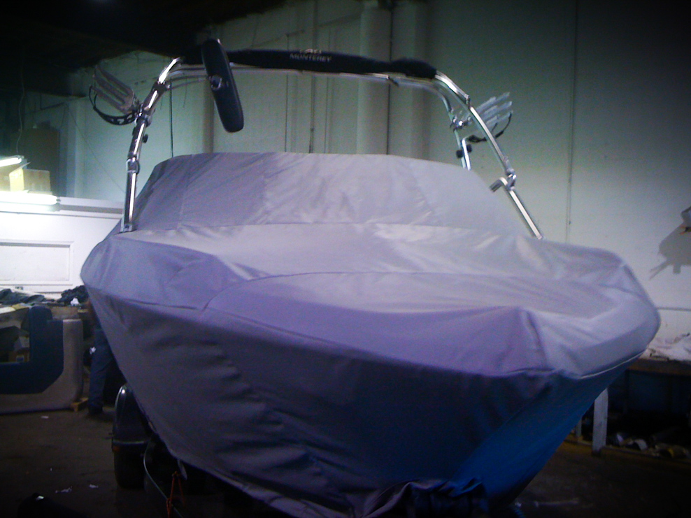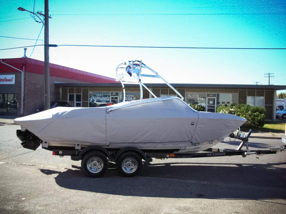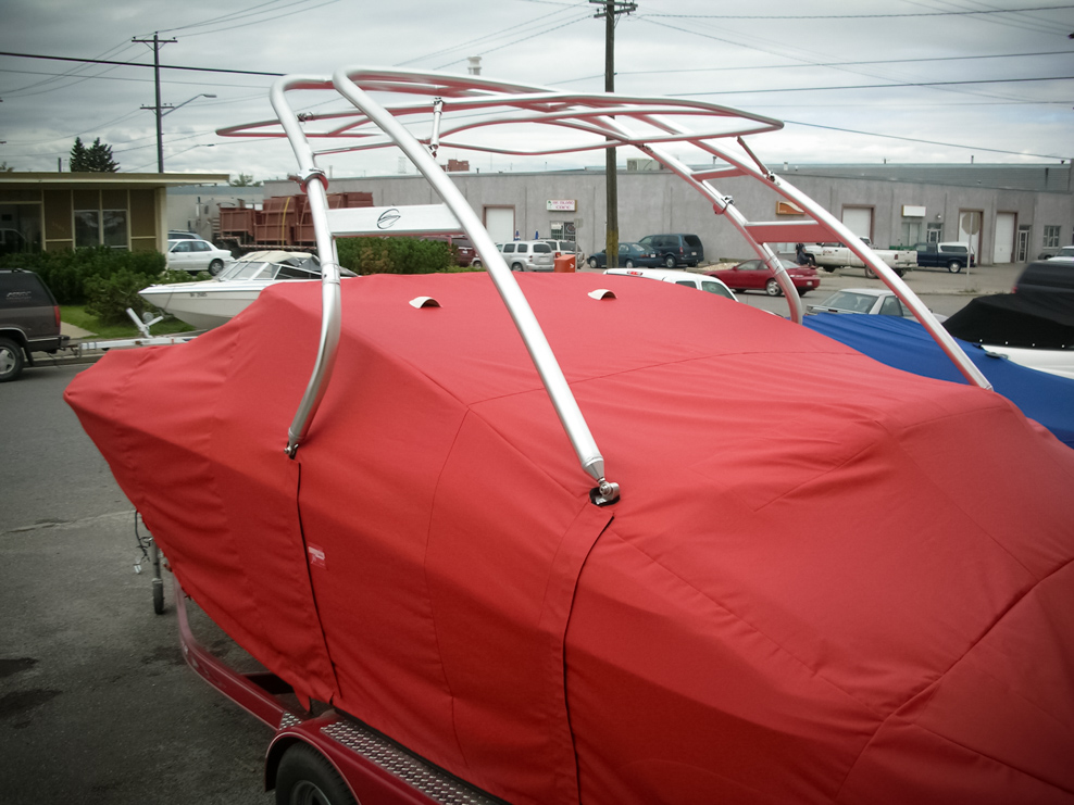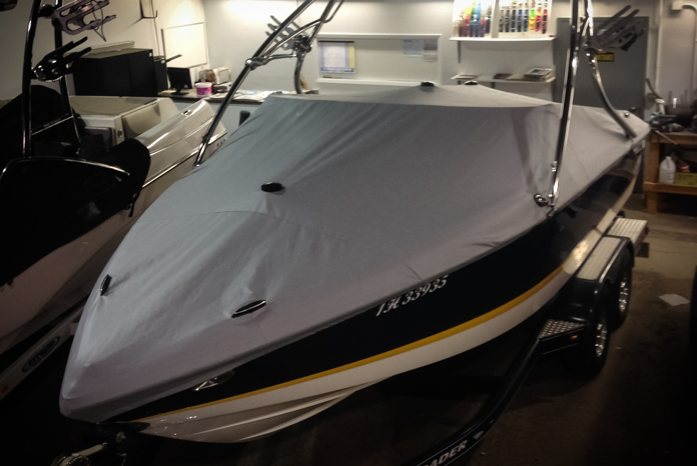 All of our tops are triple reinforced at all wear points and double reinforced along the snap line. Vents are included for air turbulence when traveling and to prevent condensation when stored. CS fasteners are installed to secure the top at high speed towing. Finally we include two telescopic poles for bow and cock pit area for rain and snow runoff.