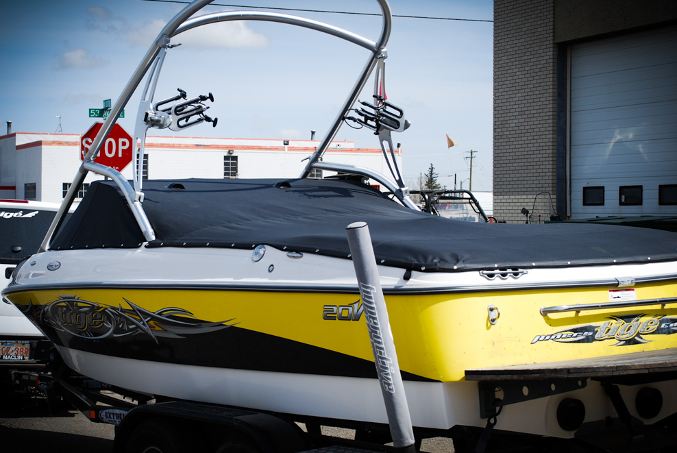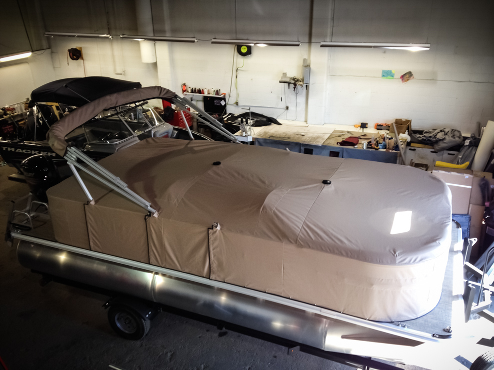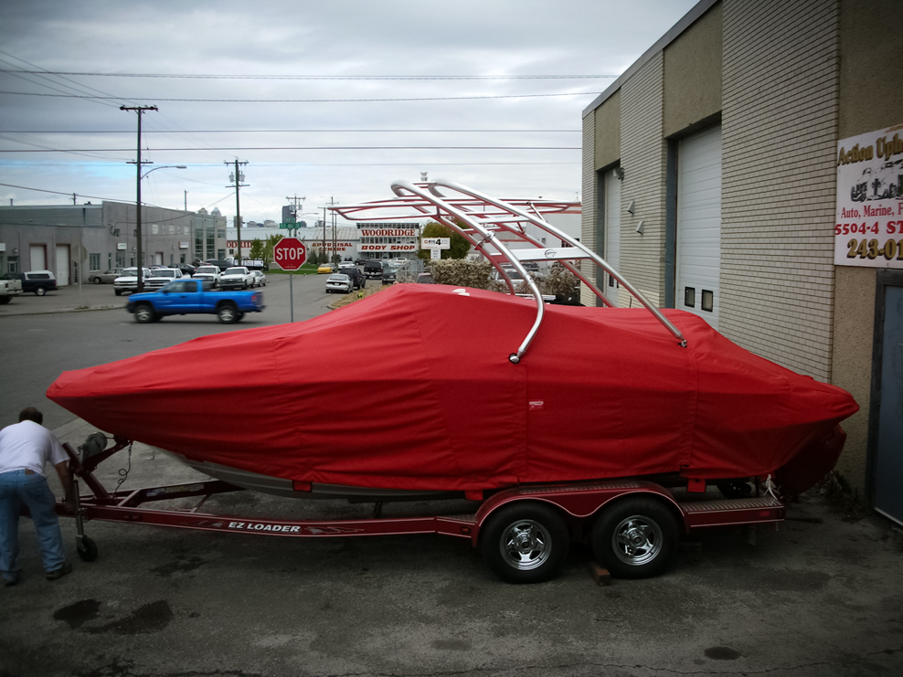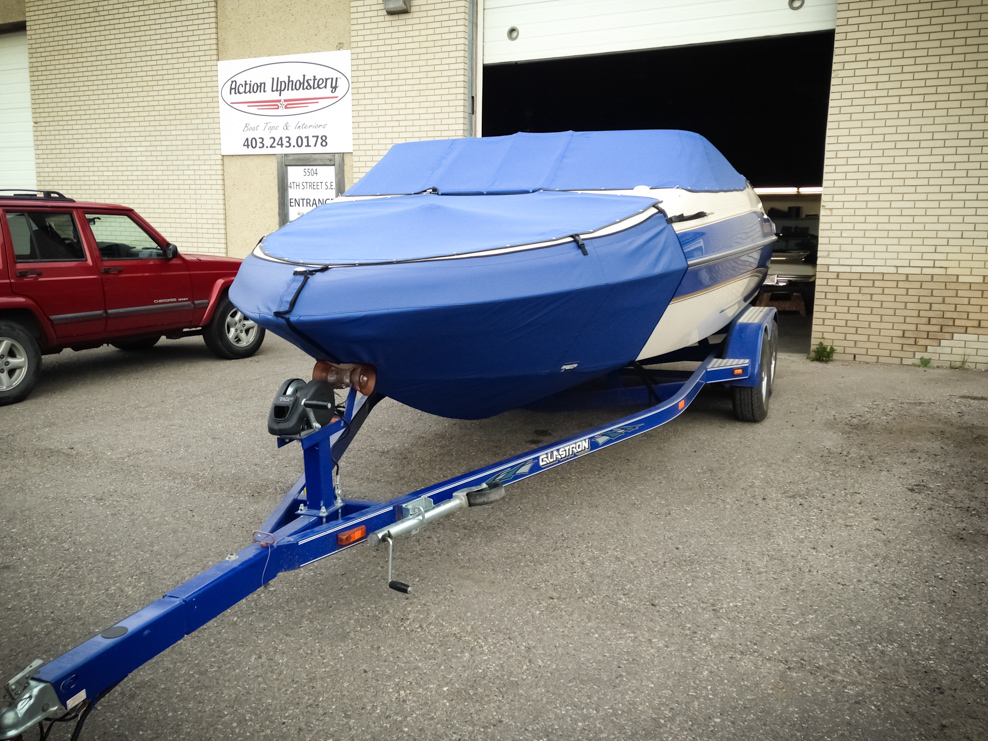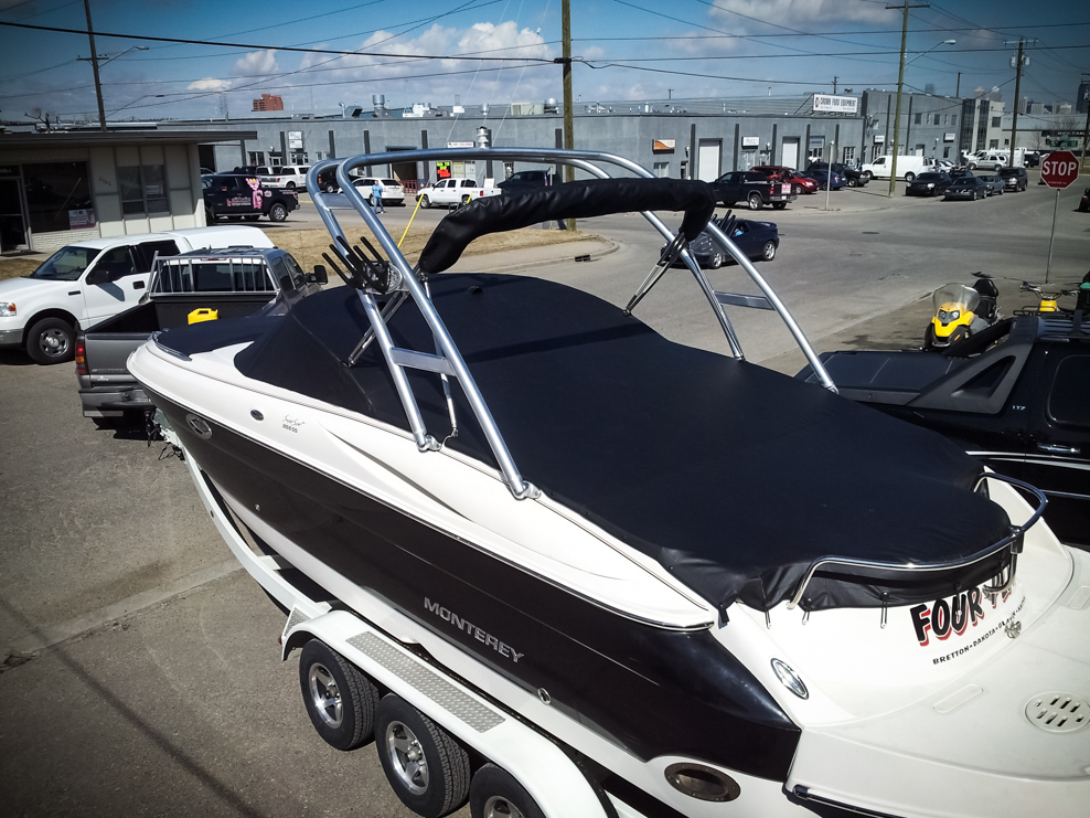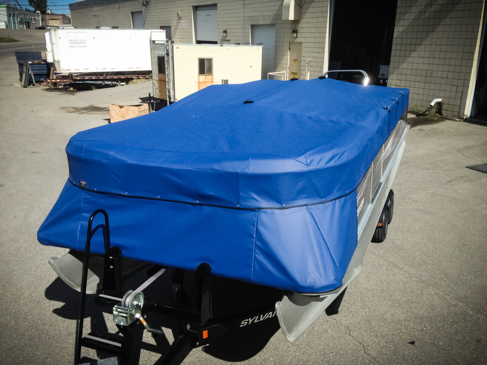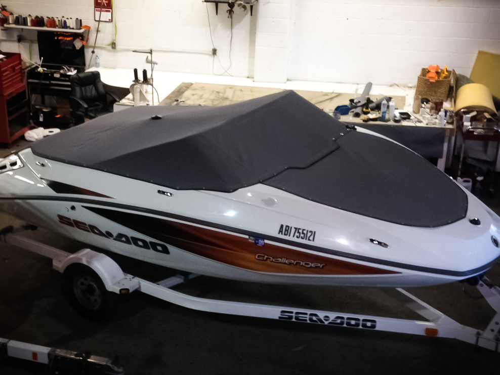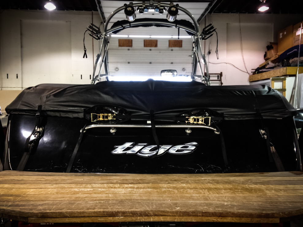 All of our tops are triple reinforced at all wear points and double reinforced along the snap line. Vents are included for air turbulence when traveling and to prevent condensation when stored. CS fasteners are installed to secure the top at high speed towing. Finally we include two telescopic poles for bow and cock pit area for rain and snow runoff.