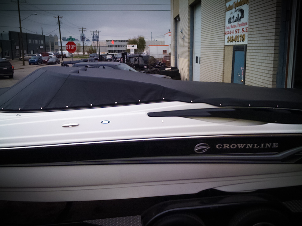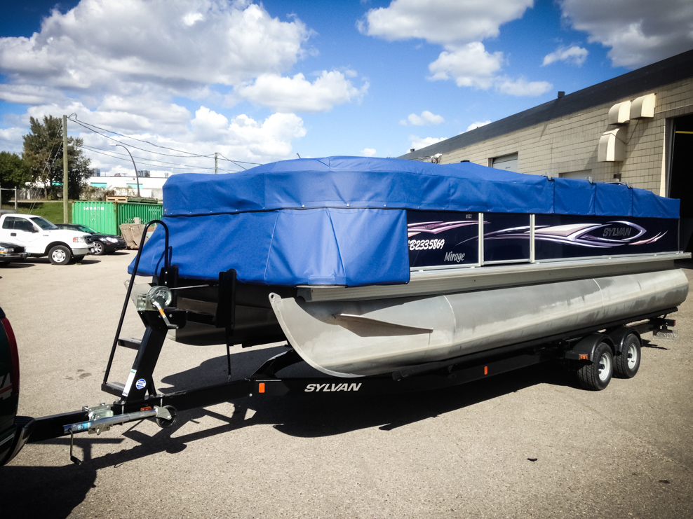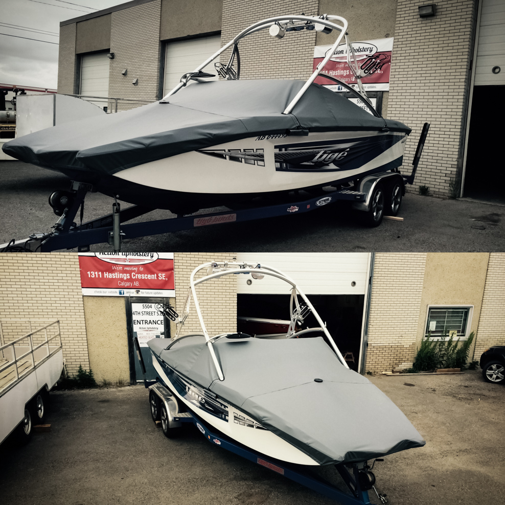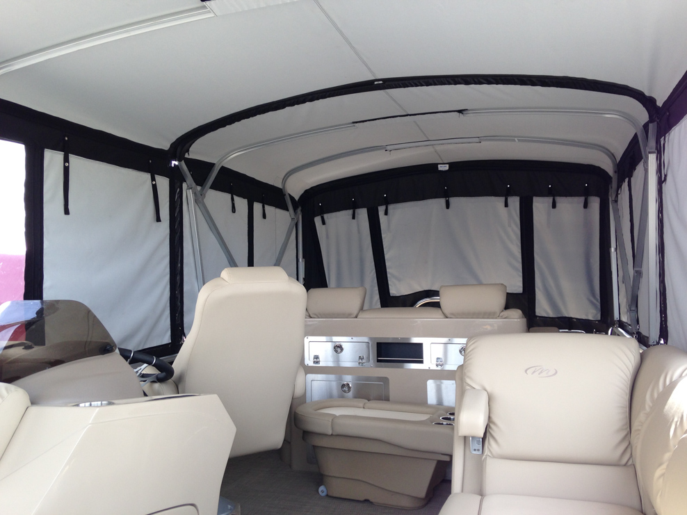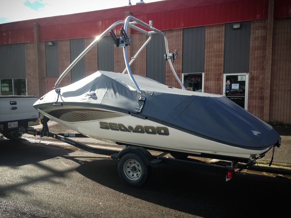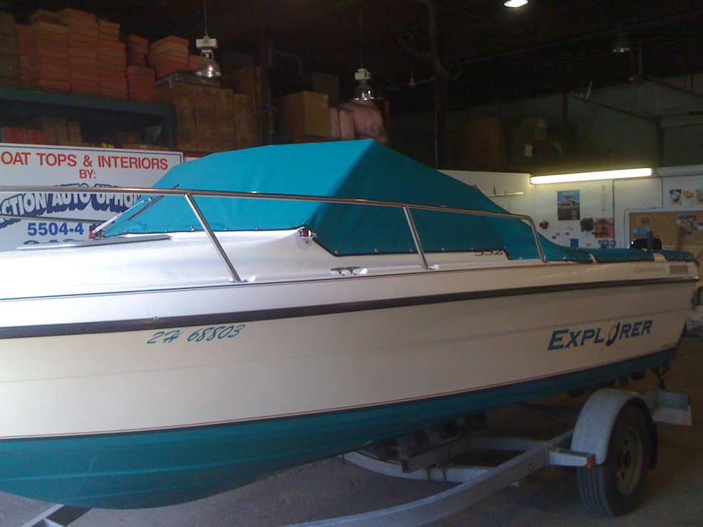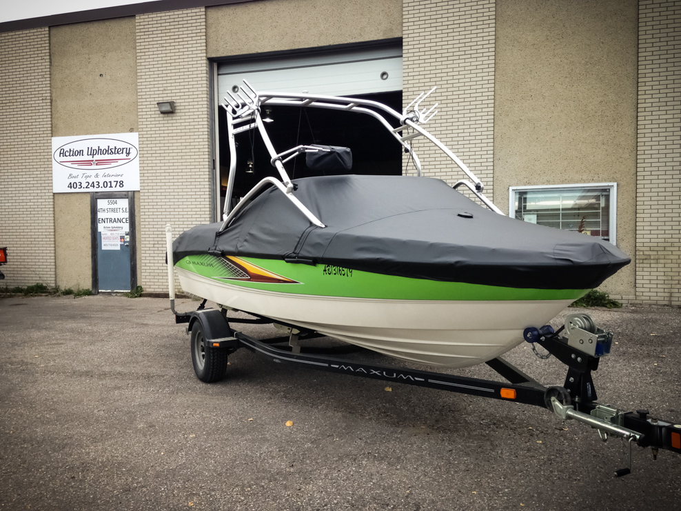 All of our tops are triple reinforced at all wear points and double reinforced along the snap line. Vents are included for air turbulence when traveling and to prevent condensation when stored. CS fasteners are installed to secure the top at high speed towing. Finally we include two telescopic poles for bow and cock pit area for rain and snow runoff.
